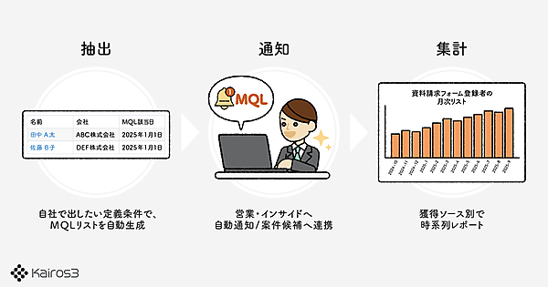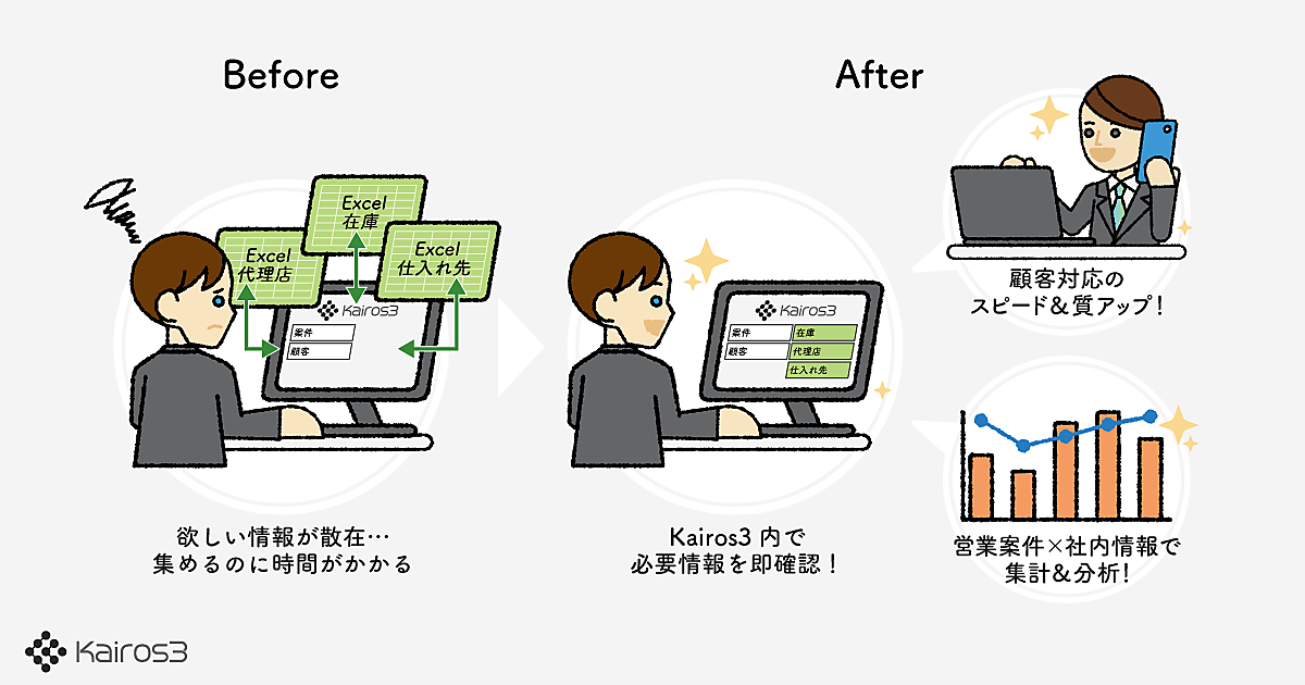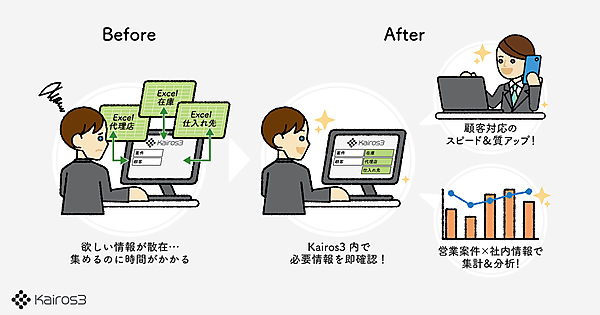 Kairos3は、MA(マーケティングオートメーション)とSFA(営業支援システム)の一体型ツール。営業・マーケティングの情報が部署や担当者ごとに保存され、部署をまたいだ共有が難しい企業が多いことから、まとめて管理できる機能をKairos3に追加した。部門ごとに管理している営業履歴、取引先データ、在庫の情報から必要なデータを探す手間をなくす。