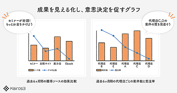 分散データ管理機能は「カスタムデータベース」で、個別管理していた情報がKairos3上で登録・共有可能。商談データと関連付けて表示できる。このほか、営業・マーケティングの成果が一目で比べられる「2軸グラフレポート」▽自社基準で見込み顧客を抽出できる「MQL(マーケティング活動で作られる見込み客)自動集計」▽SMS配信機能--を加えた。