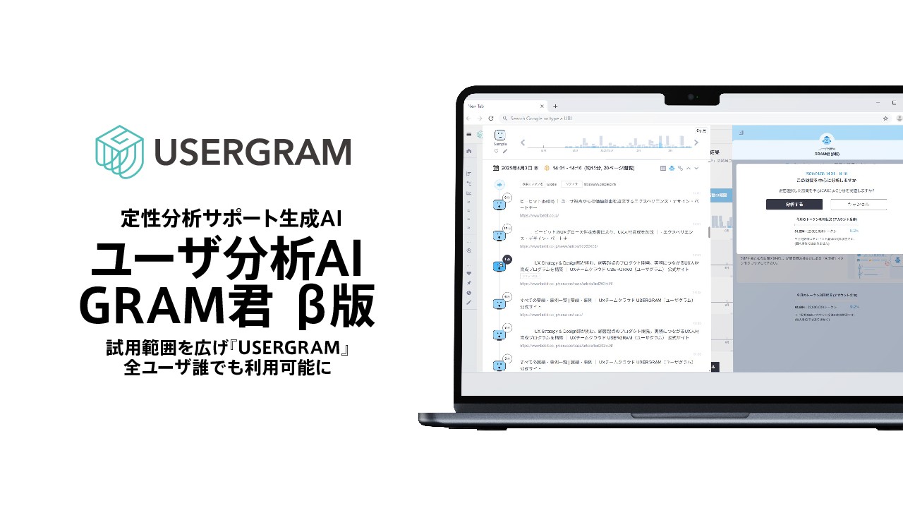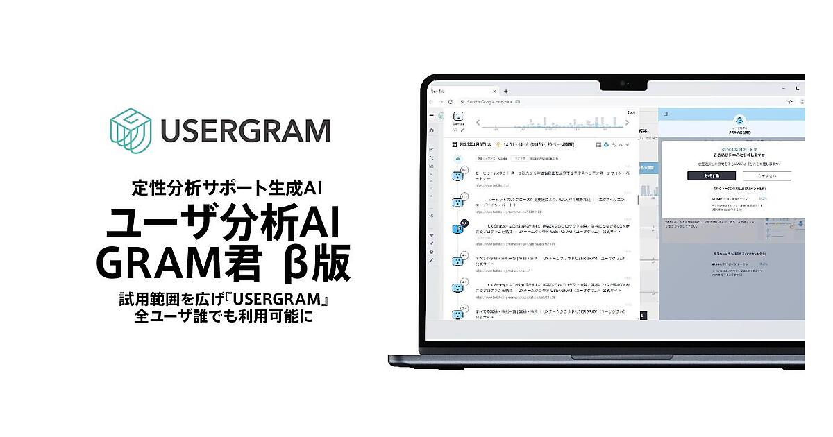 UX(ユーザー体験)改善支援事業のビービットは、同社の定性分析(数値で表せないデータに基づく分析)サポート生成AI(人工知能)「ユーザ分析AI GRAM君」β版の試用範囲を広げ、同社のユーザー行動分析・UX改善SaaS「USERGRAM」の利用者なら試用可能にした、と10月21日発表した。これまではクローズドβ版として複数の既存顧客に限定提供していた。