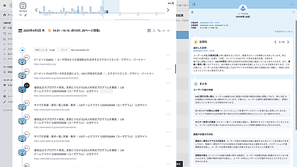 ユーザ分析AI GRAM君β版は、USERGRAMで計測している個別ユーザーの行動データの解釈やインサイト抽出を生成AIが支援する。オンラインとオフラインを横断したサービスでユーザー1人1人がとった行動をUSERGRAM上で時系列に可視化した後、生成AIが行動データを分析。ユーザーそれぞれの行動の特徴、関心、課題を提示してUX改善の立案を容易にする。