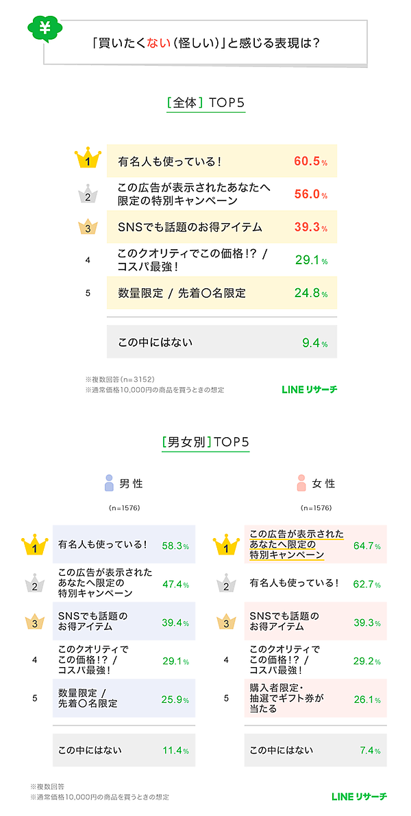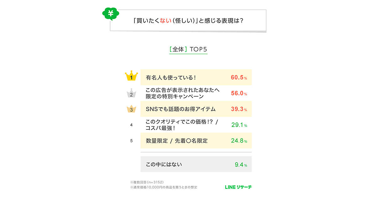 LINEリサーチは、「買いたくなる」「買いたくない」と感じる広告表現に関する調査を実施した。15歳~69歳の男女3,152名を対象に、以下の18種の広告コピーについての印象を聞いている。