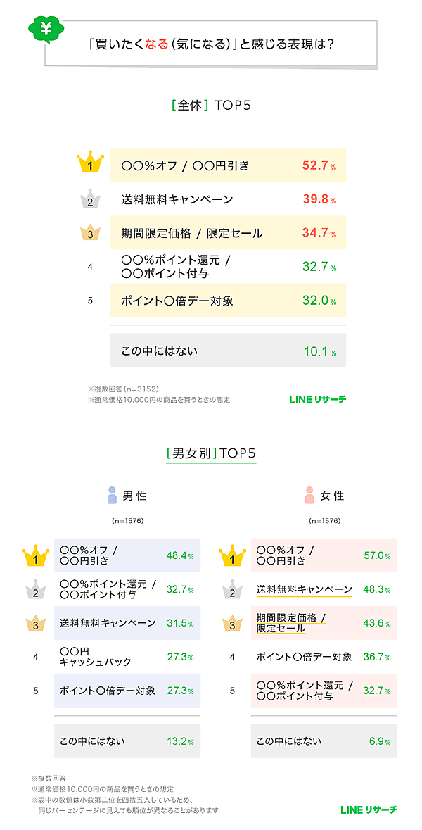 まず、「買いたくなる」と感じる表現について聞くと、全体では「○○%オフ/○○円引き」が52.7%で1位となった。2位は「送料無料キャンペーン」(39.8%)、3位は「期間限定価格/限定セール」(34.7%)と続いている。