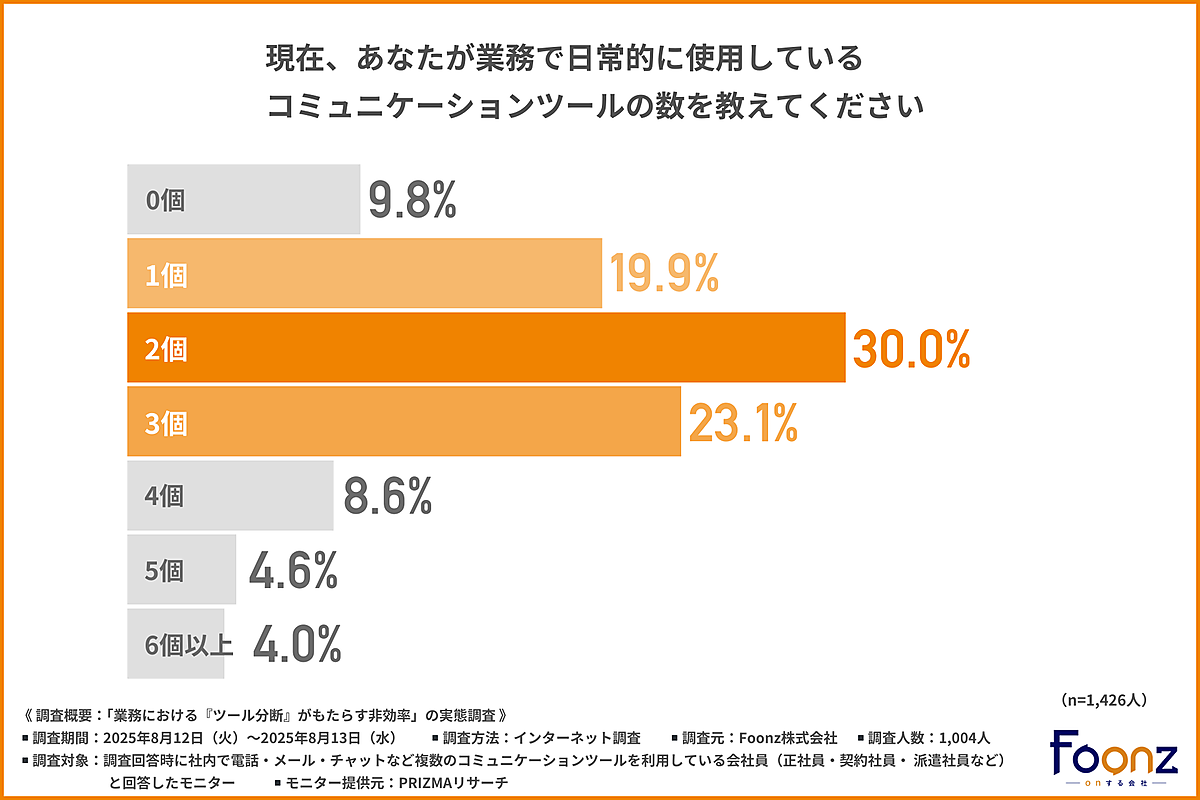 Foonzは、「『ツール分断』がもたらす非効率」に関する調査結果を発表した。社内で電話・メール・チャットなど複数のコミュニケーションツールを利用している会社員1,004人が回答している。