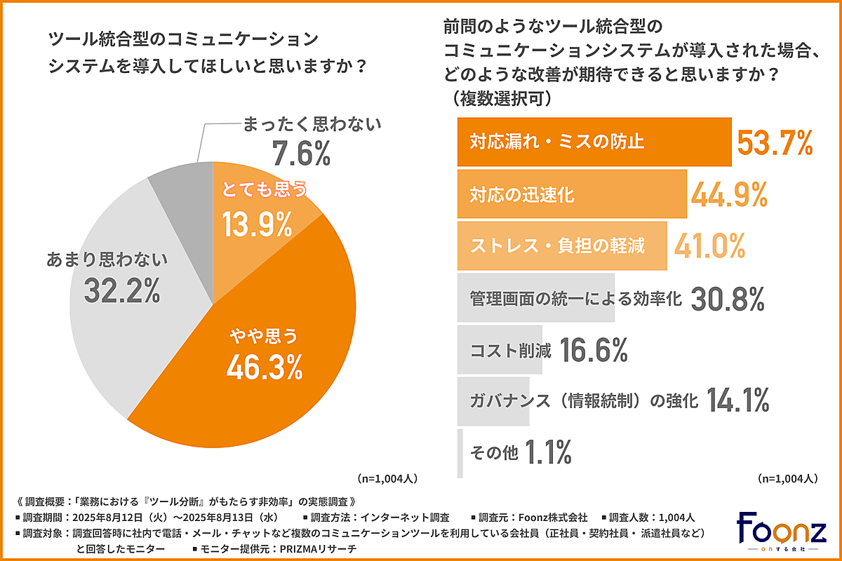 最後に「ツール統合型のコミュニケーションシステムをほしいと思いますか」という質問では、「とても思う」13.9%、「やや思う」46.3%と回答。「ツール統合型のコミュニケーションシステムが導入された場合、どのような改善が期待できると思うか」では、「対応漏れ・ミスの防止」53.7%が最多で、「対応の迅速化」44.9%、「ストレス・負担の軽減」41.0%が続き、情報や対応履歴を一元化することで確認漏れや重複作業の発生を抑えられると考えられているようだ。