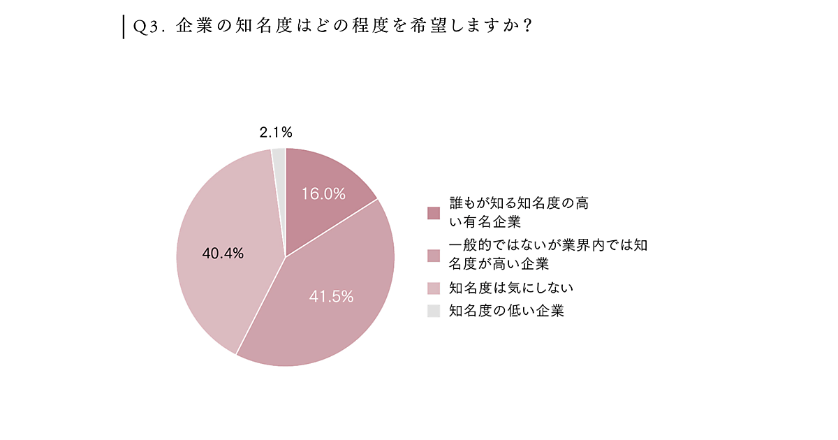 まず「企業の知名度はどの程度を希望しますか?」と聞くと、「企業のネームバリューは気にしない」40.4%で、一定数の学生が知名度にこだわらない姿勢を示した。「有名企業」よりも「自分に合う働き方・環境」を重視していると考えられる。
