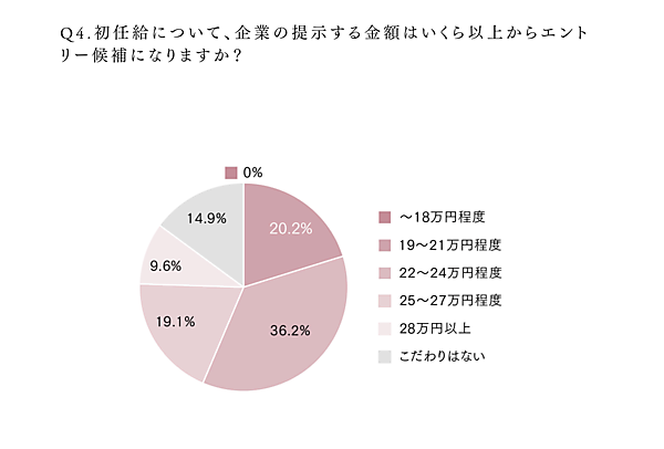 さらに具体的に、「初任給について、企業の提示する金額はいくら以上からエントリー候補になりますか?」と聞くと、「19~21万円程度」36.2%が最多で、「~18万円程度」20.2%がそれに続いた。初任給の金額を重視する一方で、実質的な安定性に関心が移行していると同調査では分析している。