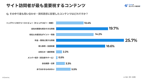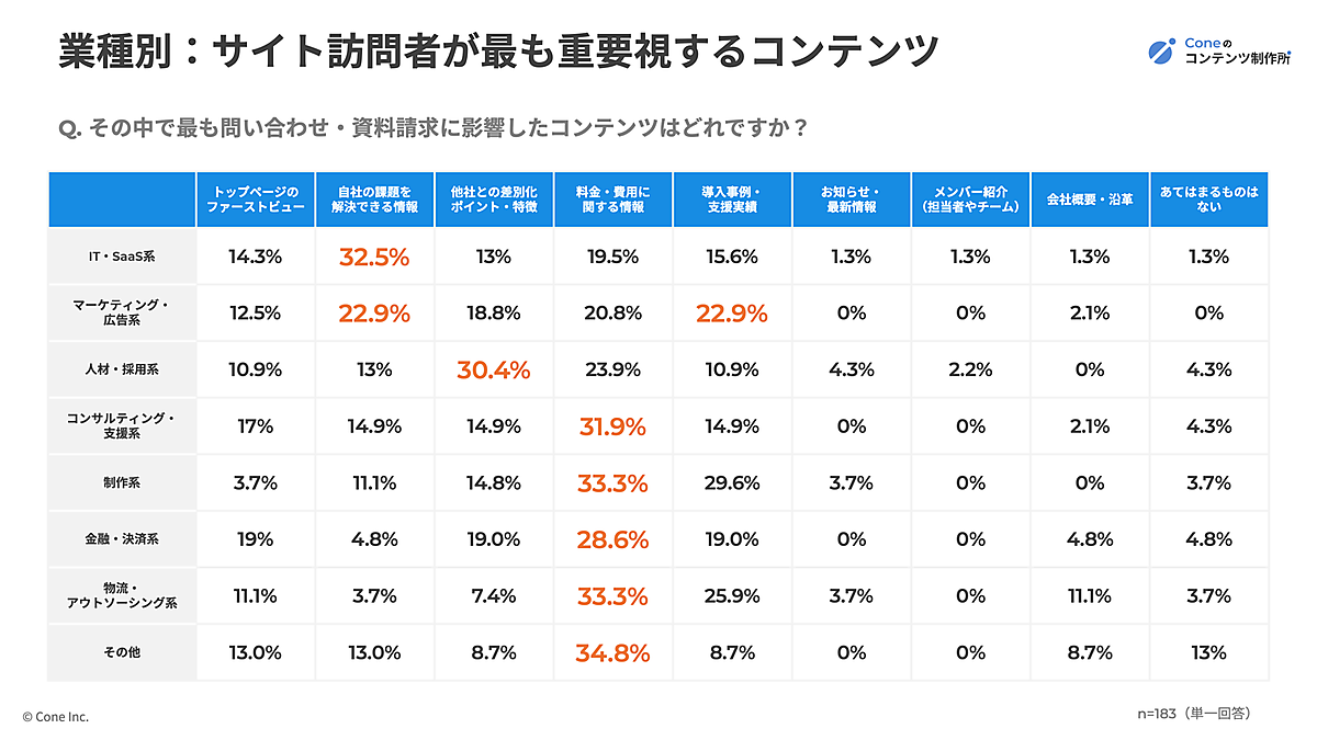 これを業種別で見ると、IT・SaaS系は「自社の課題を解決できる情報」32.5%が圧倒的なトップ。人材・採用系は「他社との差別化ポイント・特徴」30.4%がトップ。その他業種(コンサル、制作、物流など)では一律に「料金・費用に関する情報」がトップとなった。BtoBサイトは、自社の業種が持つ固有の「検討リスク」(訪問者が最も不安に感じる点)を解消できるコンテンツに注力すべきとConeでは分析している。