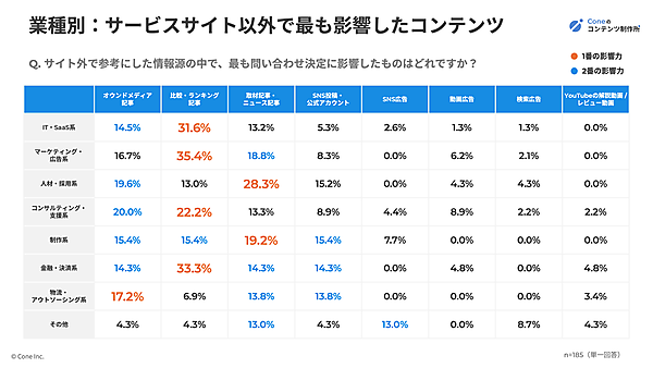 次に「サイト外でもっとも参考にした情報源」では、「比較サイトなどの、ランキング記事」18.9%がトップに入れ替わり、「業界メディアなどの、取材記事・ニュース記事」17.8%がそれに続いた。“第三者による客観的な評価・順位付け”が強い影響力を持っているのがうかがえる。