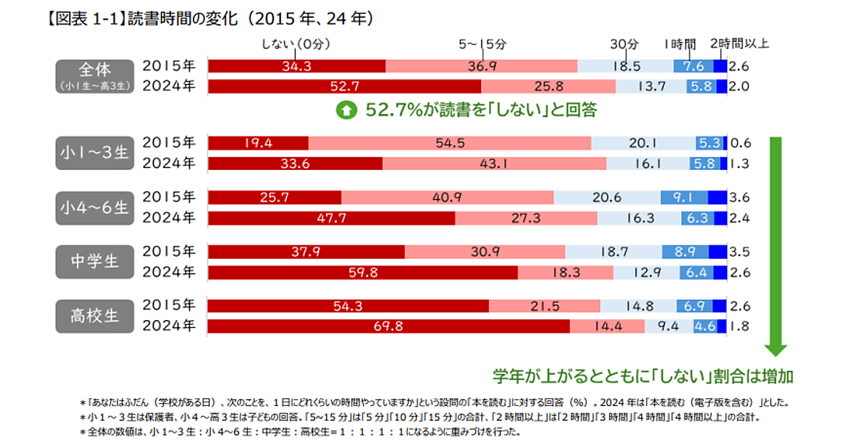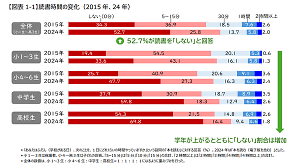 まず、1日の読書時間について聞くと、2024年は「しない(0分)」と答えた人が52.7%で、半数を超えていた。これは、10年前の2015年(34.3%)と比べ、約1.5倍に増加している。また、学年が上がるにつれ、「しない」の割合も増える傾向だった