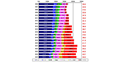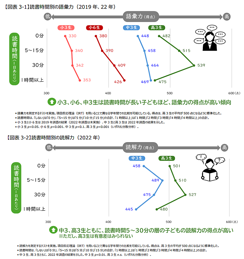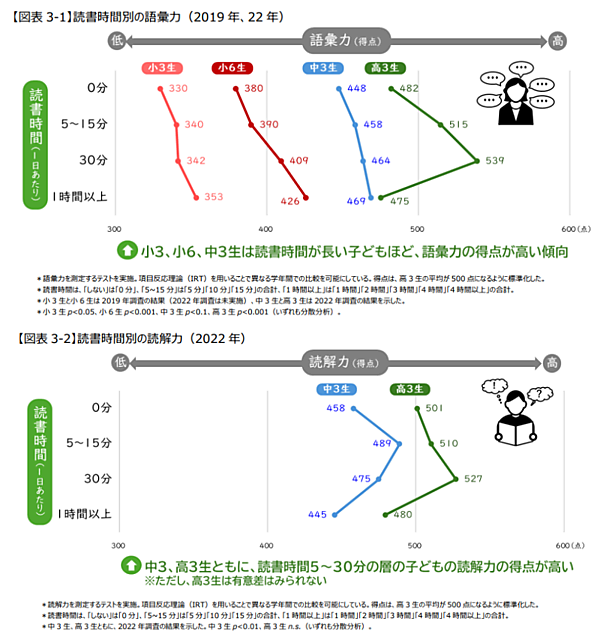 続いて、読書時間と語彙力の関係を見ると、小学3年生、小学6年生、中学3年生では読書時間が長いほど語彙力の得点が高い結果となった。高校3年生では読書時間「30分」の層が高得点となっている。また、読解力については、中学3年生、高校3年生ともに「5~15分」「30分」の層の得点が高く、「0分」「1時間以上」では低い傾向が見られた。