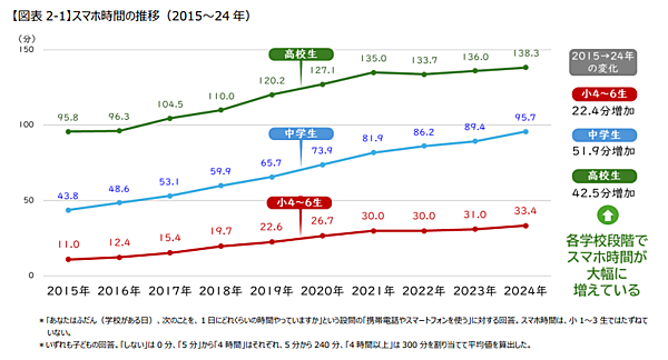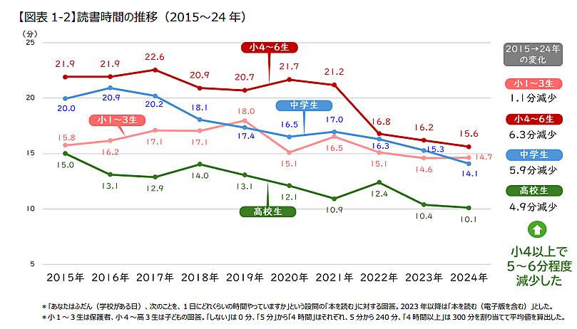 2015年から2024年にかけての経年推移を見ると、いずれの学年でも読書時間は減少傾向に。特に小学4年生以上での減り幅が大きく、小学4~6年生は6.3分、中学生は5.9分、高校生は4.9分減少した。