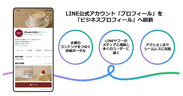 LINEヤフーは、同社が展開するコミュニケーションアプリ「LINE」の法人向けサービス「LINE公式アカウント」で、企業や店舗がLINE公式アカウントで発信する情報のポータルとなる「ビジネスプロフィール」の提供を10月24日に始めた、と同日発表した。従来の「プロフィール」を刷新した。企業や店舗の“ビジネスの顔”となり、商品・サービスや企業情報などがまとめて発信できる。