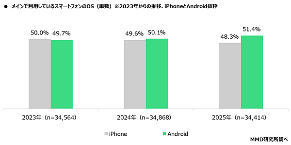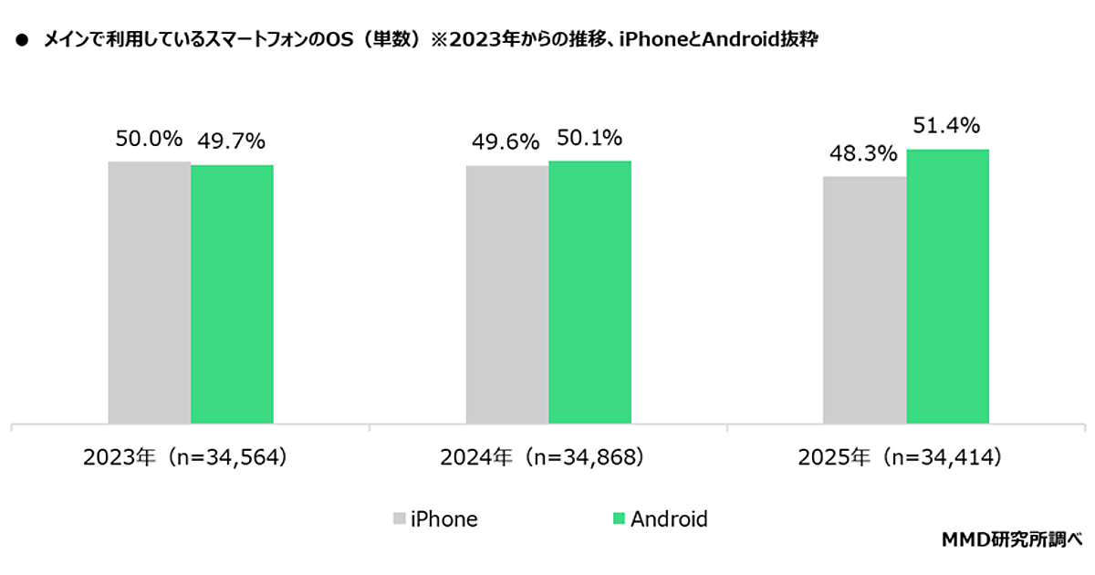 MMD研究所は、「2025年9月スマートフォンOSシェア調査」を実施した。18歳~69歳の男女40,000人を対象に調査している。