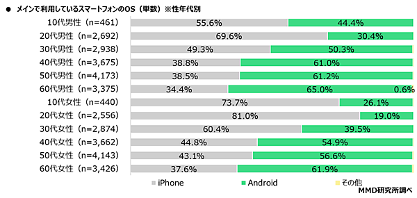 性年代別で見ると、iPhoneは「10~20代女性」や「20代男性」で利用率が高い傾向に。一方で、Androidは「60代男女」の利用率が高く、若年層とシニア層で違いが見られた。