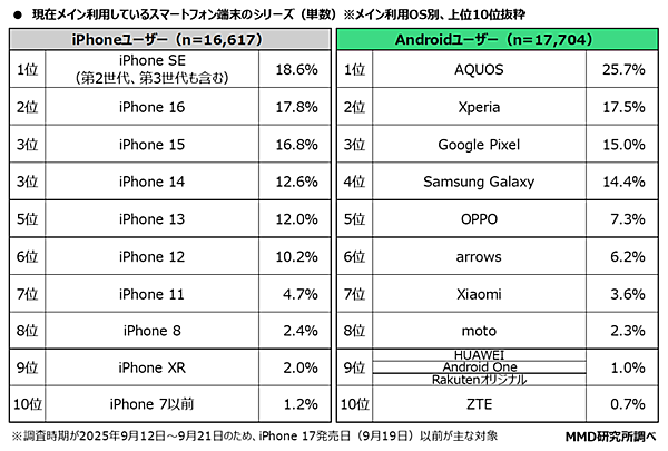 一方で、Androidユーザーでは「AQUOS」が25.7%で最多となり、以下「Xperia」が17.5%、「Google Pixel」が15.0%と続いた。なお、調査時期の関係上、iPhone 17発売以前のシリーズが主な対象となっている。