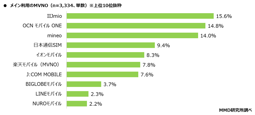 メイン利用のスマートフォンでMVNOを契約している3334人に契約サービスを聞くと、「IIJmio」15.6%と最も多く、以下「OCNモバイルONE」14.8%、「mineo」14.0%が続いた。