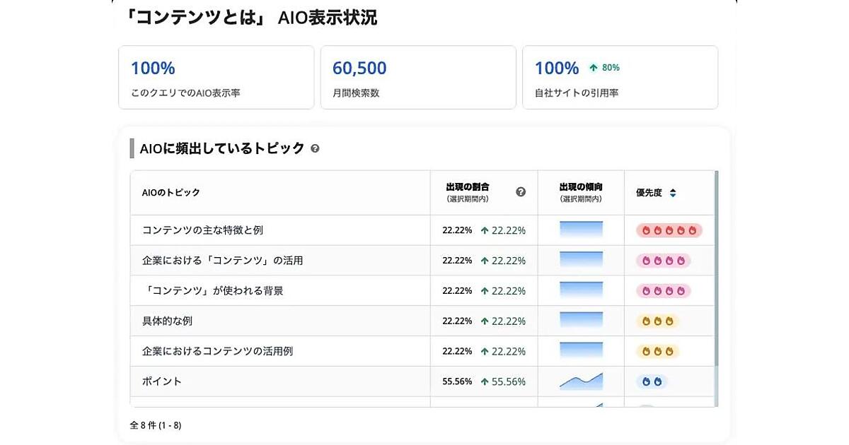 AIOは検索結果の上部にAI(人工知能)による回答文や関連トピックが同時に提示される。生成される情報が頻繁に替わり、テキスト構造や参照方法が複雑で従来のSEOツールや人力調査では動向把握が難しかった。同社はSEOの第一人者の辻正浩氏の知見をもとにAIOの生成文を分析してコンテンツ施策に活用できる機能を開発。ミエルカSEO契約者はAI検索時代でも効果的なSEO施策を実行し、AIOと自然検索の両面で成果を実感できる。