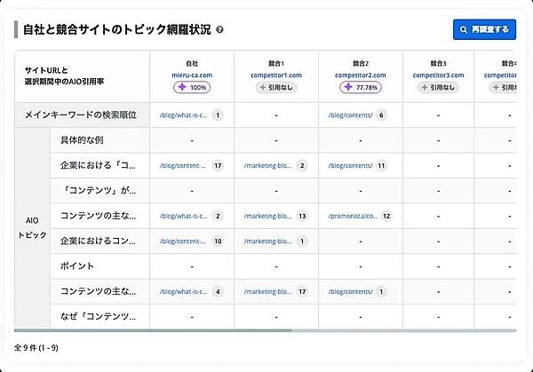 AIO回答文からHTMLで「h2」タグとして記述される主要な小見出し(H2相当)の関連トピックを自動的に抽出し、一覧化する。各トピックごとに自社サイトや競合サイトの対応状況を自動判定し、対応URLや検索順位も表示する。自社が未対応のトピックをハイライトで明確に示すことで次に取り組むべきコンテンツ施策が一目で分かる。分析結果はExcel形式で出力でき、社内共有やレポート作成に活用できる。