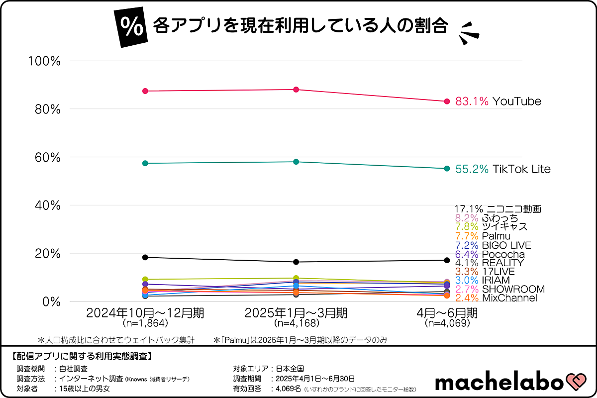 - 【各ブランドの有効回答数】Palmu:1922人、TikTok Lite:1450人、SHOWROOM:940人、17LIVE:938人、MixChannel:886人、YouTube:883人、Pococha:838人、ニコニコ動画:822人、IRIAM:663人、REALITY:662人、ふわっち:589人、ツイキャス:580人、BIGO LIVE:571人。