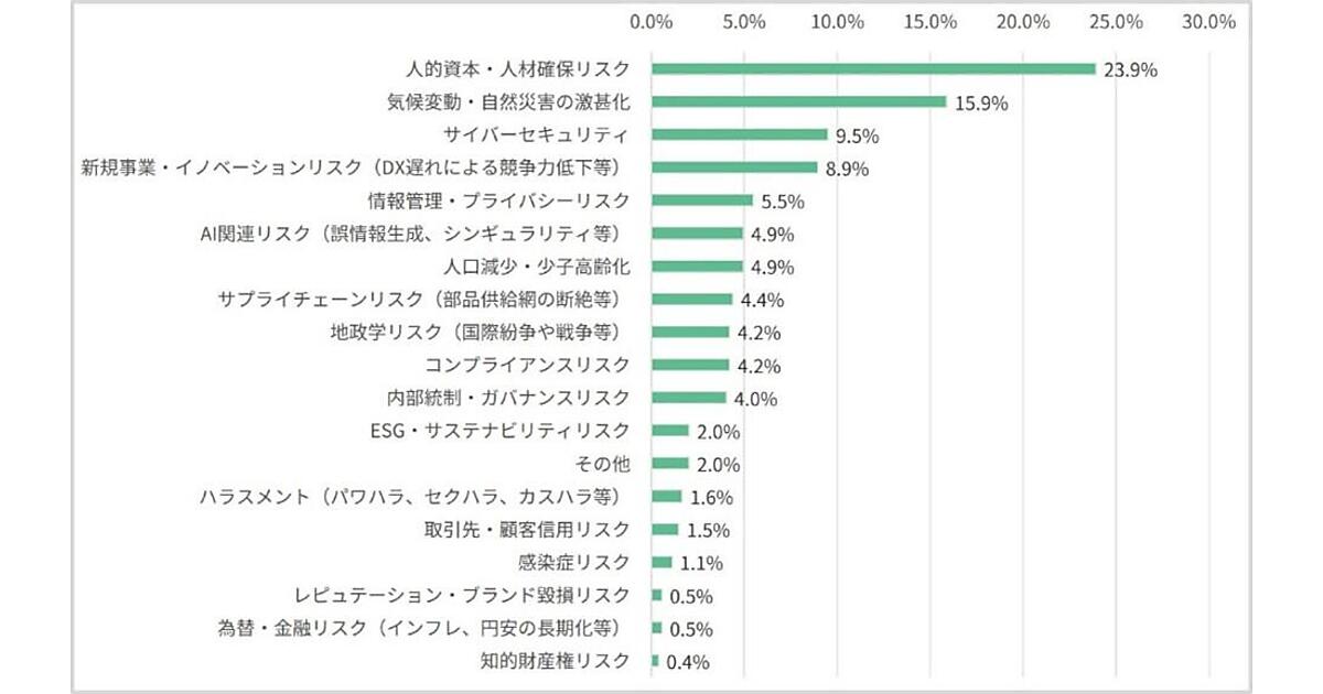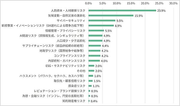 まず、3年から5年後に企業にとって最大の脅威となりそうなリスクを聞くと、「人的資本・人材確保リスク」が23.9%で最も高く、ついで「気候変動・自然災害の激甚化」が15.9%、「サイバーセキュリティ」が9.5%と続いた。