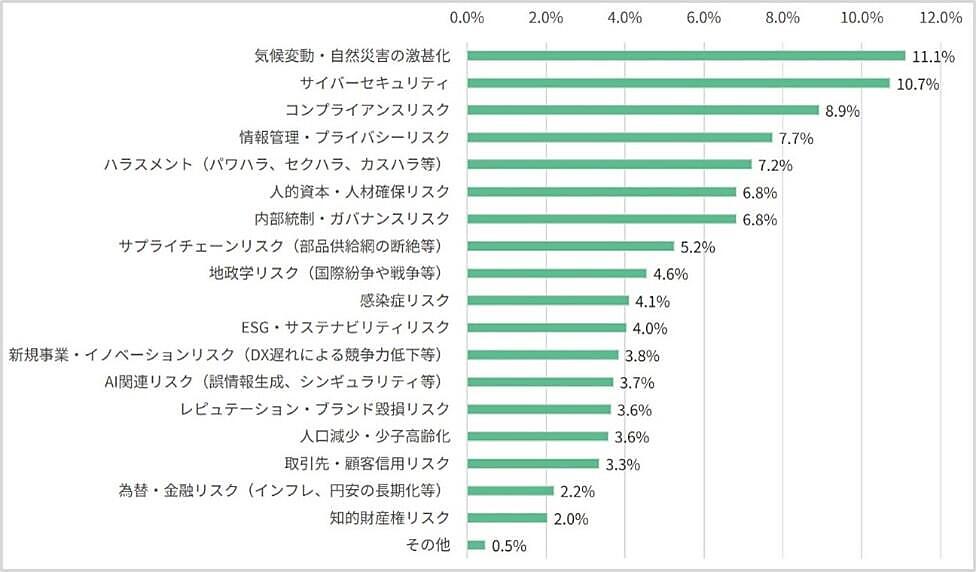 また、業務上で最も関心の高いリスクを聞くと、「気候変動・自然災害の激甚化」が11.1%で最多に。以下、「サイバーセキュリティ」が10.7%、「コンプライアンスリスク」が8.9%と続き、事業継続や社会的信頼に直結する項目が上位を占めた。