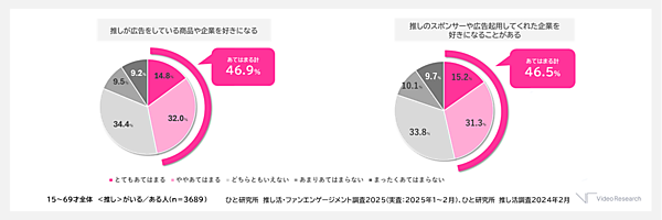さらに、推しの広告起用について、「推しが広告をしている商品や企業を好きになる」は46.9%、「推しのスポンサーや広告に起用してくれた企業を好きになる」は46.5%という結果に。推し活マーケティングが、企業や商品のイメージ向上にもつながっていることが明らかになった。
