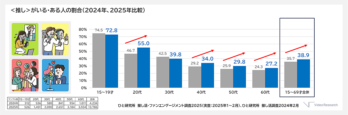 まず、「推し」がいるかどうかを聞くと、全体では38.9%が「いる」と回答した。2024年調査と比較すると、ほぼすべての年代でこの割合が上昇しており、10代では7割以上、20代では過半数の人に「推し」がいることがわかった。