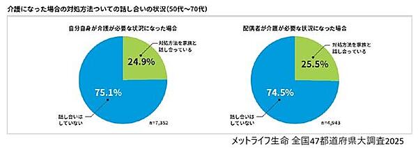 次に「介護」について「自分自身/配偶者の介護が必要になった場合の対処について、家族と話し合っているか」を聞くと、自分自身で24.9%、配偶者で25.5%が「話し合っている」としており、3割に達していない。