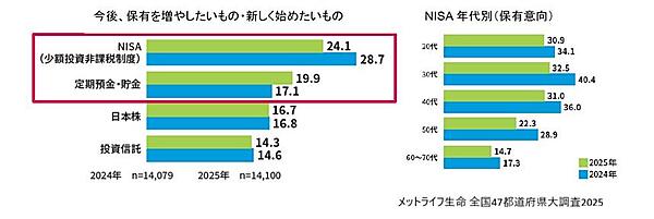 そのためか「資産の保有・運用意向」において、NISAが昨年より減少したのに対し、定期預金・貯金が増加するなど保守的な傾向の変化が見られたとのこと。