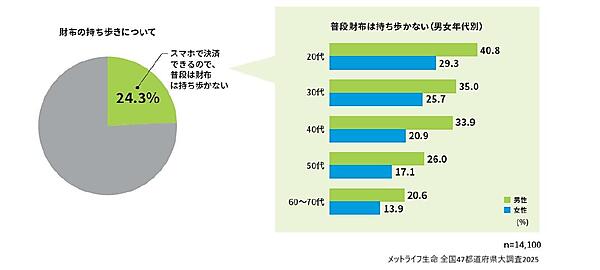 日常生活に焦点を移し「財布の持ち歩き」について聞くと、「スマホで決済できるので、ふだんは財布は持ち歩かない」という人は24.3%。年代別では20代は男性40.8%、女性29.3%と特に多く、若年層ほど財布を持ち歩いていない。