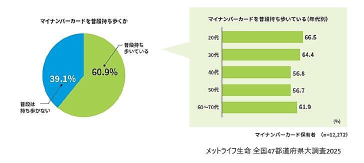 一方「マイナカードの持ち歩き」では、「ふだん持ち歩いている」が60.9%と大きく上回る最新状況が明らかとなった。こちらは20代~30代・60代~70代が平均より多い一方、40代~50代は5割台にとどまる。身分証明に加え、免許証、保険証などでの利用で差が出ていると考えられる。