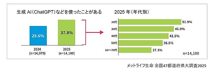 「生成AI(ChatGPT)の利用」については、利用者が前年28.6%から37.8%と大きく増加。年代別では20代の利用者が5割以上に達する。また60~70代でも27.3%と一定数が存在した。