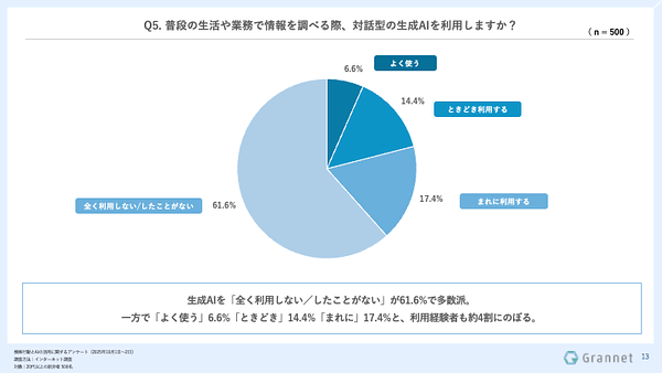 グランネットは、「検索行動とAIの活用に関するアンケート」を実施した。GoogleのAI Overviewsの活用状況について、20代以上の就業者500名が回答している。