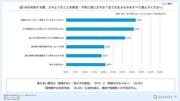 一方で、AIを利用する際に感じる懸念としては、「情報が古い、間違っているかもしれない」(37.0%)、「どの情報をもとに答えているのかわからない」(35.9%)が上位に。情報源の信頼性や精度に関して不安を感じている人も多いようだった。