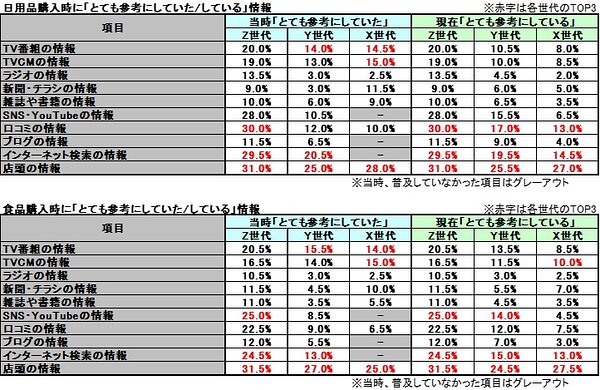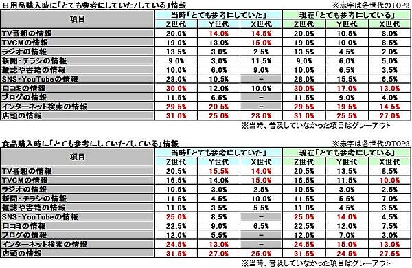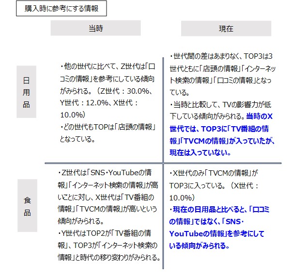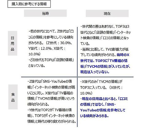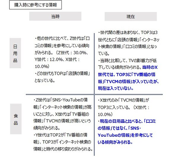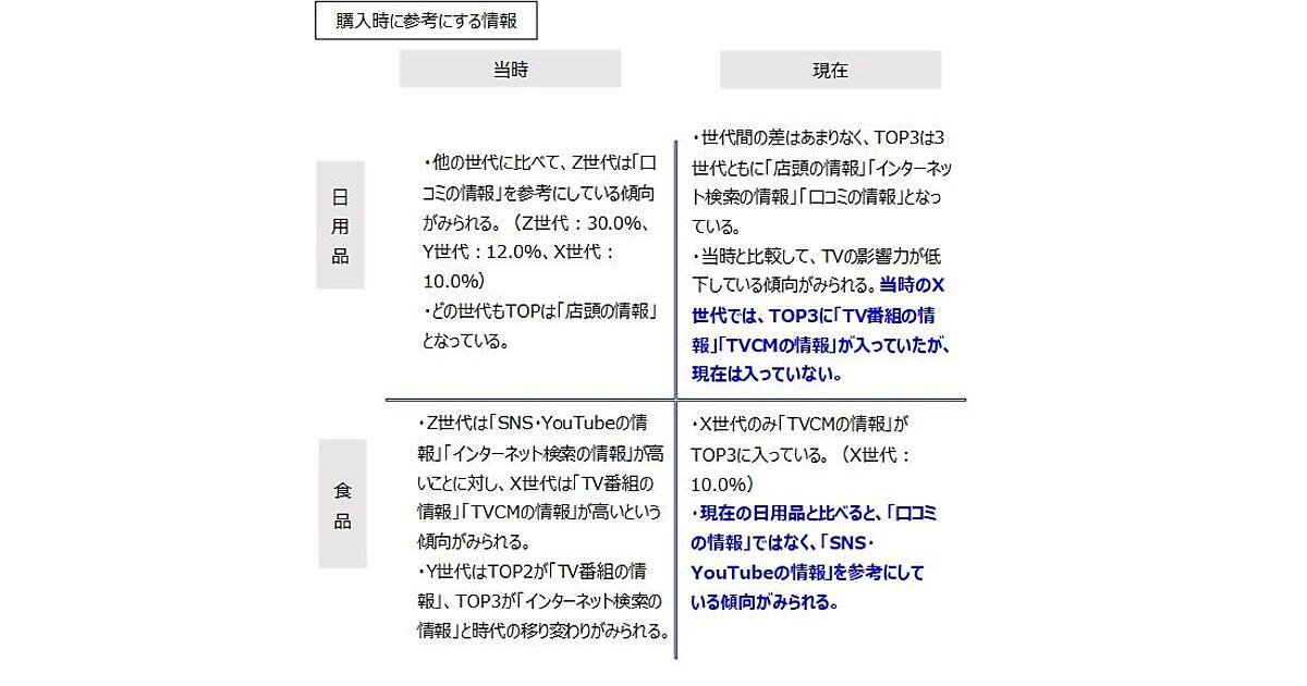 また、インターネットの普及により、Z世代は日用品では「口コミ」、食品では「SNSやYouTubeなどの情報」を重視する傾向に。一方で、X世代は若い頃に「テレビ番組」や「TVCM」から大きな影響を受けており、現在でも食品購入時には「TVCMの情報」を参考にする人が一定数いるものの、全体的にテレビの影響力は低下していることがわかった。