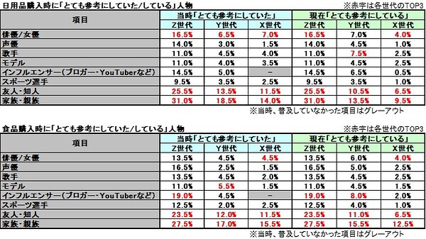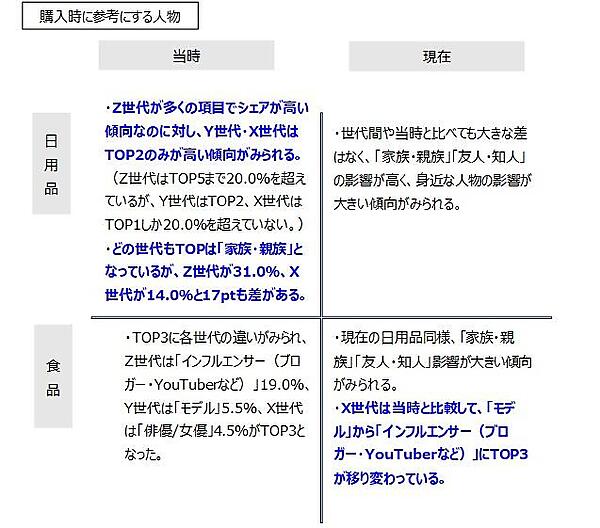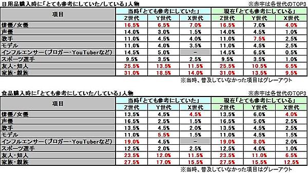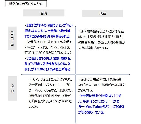 同様に、20~25歳頃の商品購入時に参考にしていた(している)人物について聞くと、どの世代でも「家族・親族」「友人・知人」の意見を重視する人が多かった。Z世代においては、日用品では「俳優/女優」、食品では「インフルエンサー(ブロガー・YouTuberなど)」を参考にする人が多く、購入するものによって影響を受ける人物が異なるようだった。