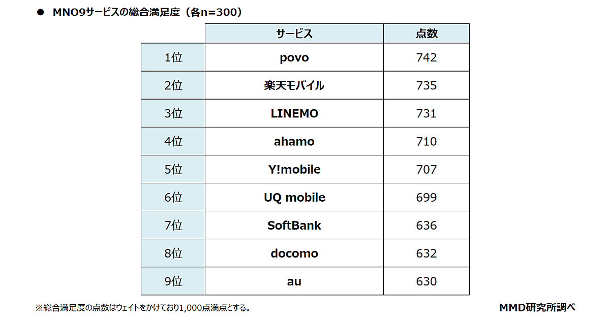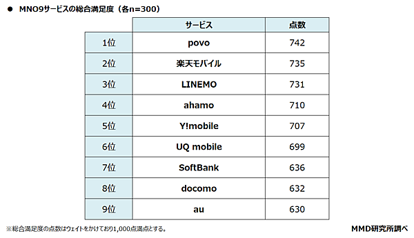 さらにMNOを利用している2,700人に「利用しているサービスの総合満足度」を聞くと、「povo」742ポイントが最も高く、以下「楽天モバイル」735ポイント、「LINEMO」731ポイントが続いた。
