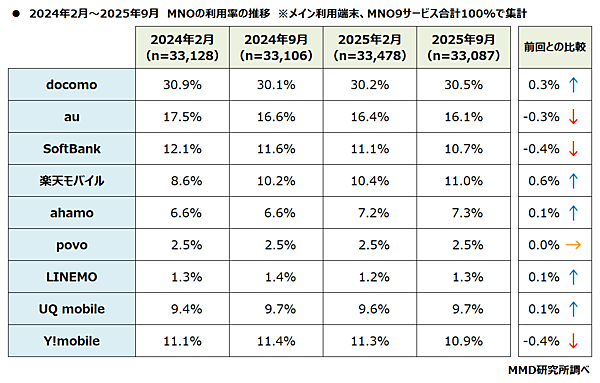 MMDLaboが運営するMMD研究所は、「2025年9月 MNOのシェア・満足度調査」の結果を発表した。予備調査では18歳~69歳の男女4万人、本調査ではMNO利用者2700人が回答している。