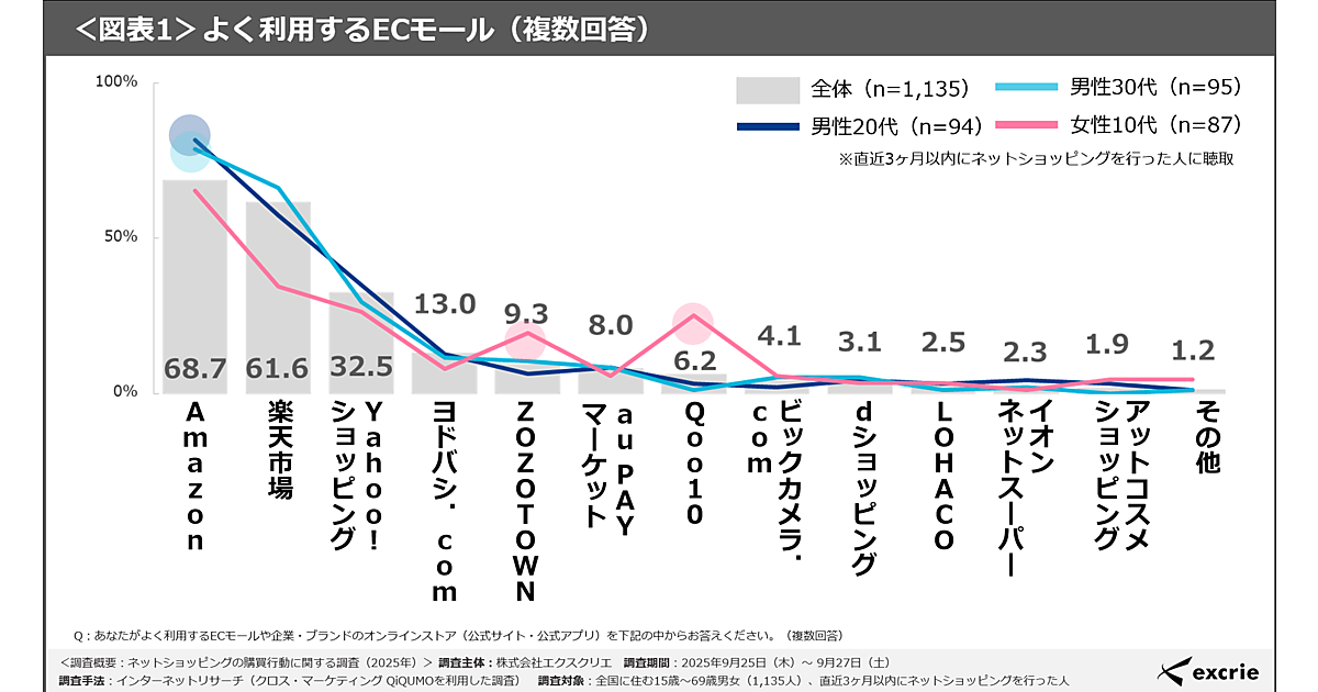 クロス・マーケティンググループのグループ会社であるエクスクリエは、「ネットショッピングの購買行動に関する調査(2025年)」を実施した。15歳~69歳男女1,135人が回答している。