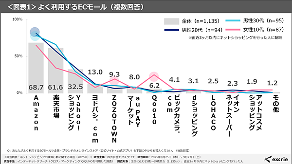 まず、直近3か月以内にネットショッピングを行った人に対し、よく利用するECモールを聞いたところ、全体では「Amazon」が68.7%で最も高く、ついで「楽天市場」が61.6%と続いた。性年代別で見ると、男性20代~30代は「Amazon」の利用が多く、女性10代では「Qoo10」や「ZOZOTOWN」などのコスメ・ファッション系ECサイトが人気だった。