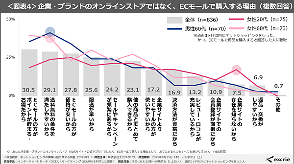 最後に、企業オンラインストアではなくECモールを利用する理由を聞くと、こちらも「ECモールの方がポイントが貯まる・お得だから」が最多に。性年代別で見ると、女性20代では「企業サイトの存在を知らないから」、男女60代では「送料無料の条件を満たしやすいから」という意見が目立った。