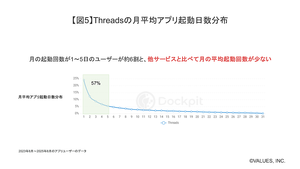 最後に、月の平均アプリ起動日数の分布を見ると、Threadsでは「月に1~5日」のユーザーが57.0%を占めており、「週に1回程度」の利用が主流であることがわかった。一方で、Xでは「月に1~5日」のユーザーは33.0%と比較的少なく、6日以上使用する人が大半を占める結果になった。