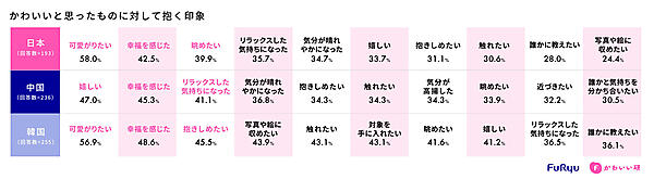 中国の1位は「嬉しい」47.0%で、そのほかも「気分が晴れやかになった」「気分が高揚した」「誰かと気持ちを分かち合いたい」といった“気分が上がった”ことを示す回答が多い。一方韓国は「抱きしめたい」「触れたい」「手に入れたい」が多い。これらに対し日本は「眺めたい」39.9%が3位となっており、所有欲・接触欲より“あえて距離をおいて愛でたい”という傾向がうかがえる結果となっている。