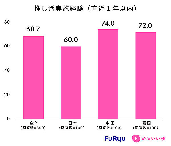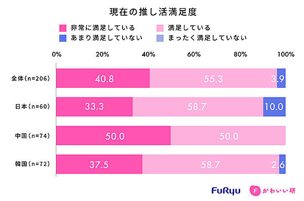 続いて「直近1年の推し活経験」については、中国が74.0%ともっとも多く、韓国72.0%、日本60.0%の順。「推し活の満足度」でも、中国が100%、韓国が97.2%、日本が90.0%の順で、中国・韓国の推し活熱が高い。日本は“かわいいの判断”や“かわいいに対しての活動”がやや消極的と言える。