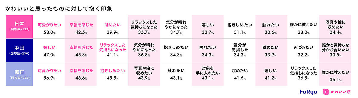 フリューかわいい研究所は、「日本・中国・韓国の“かわいい”の捉え方」に関する調査結果を発表した。“かわいい”と感じる対象や基準、好きなキャラクターや推し活経験などについて、日本・中国・韓国在住の15~35歳女性300人(各国100人ずつ)が回答している