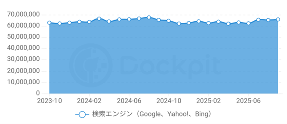 まず、AI検索時代において「検索離れ」や「Google離れ」が実際に起きているのかどうかを調べたところ、Google・Yahoo! JAPAN・Bingの検索結果画面に接触したユーザー数は大きく変化していないことがわかった。