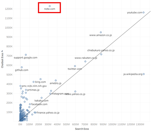 生成AI経由の流入※と検索エンジン経由の流入の関係を分析したところ、「検索エンジンからの流入が多いサイトほど、生成AI経由の流入も多い」という正の相関関係が見られた。ただし「note」はこの傾向から外れており、生成AI流入の期待値を約4倍上回っていた。