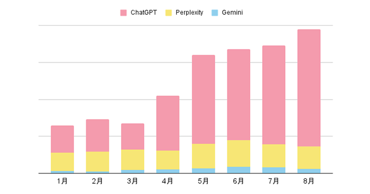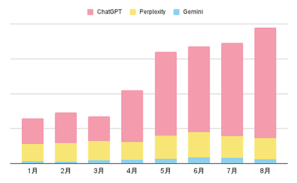 また、生成AI経由でのnote流入数を見ると、2025年3月から8月の5か月で約3倍に増加していた。サービス別では特に「ChatGPT」からの流入が急増しており、伸び率が突出している。
