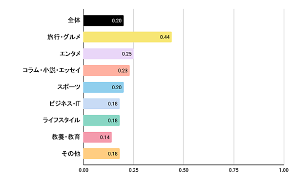 最後に、noteにおける検索流入とAI流入の相関係数をカテゴリー別に分析したところ、「旅行・グルメ」が0.44と他のカテゴリーに比べてやや高い結果に。旅行やグルメは、検索とAIの双方で流入する傾向が強いジャンルであることがわかった。
