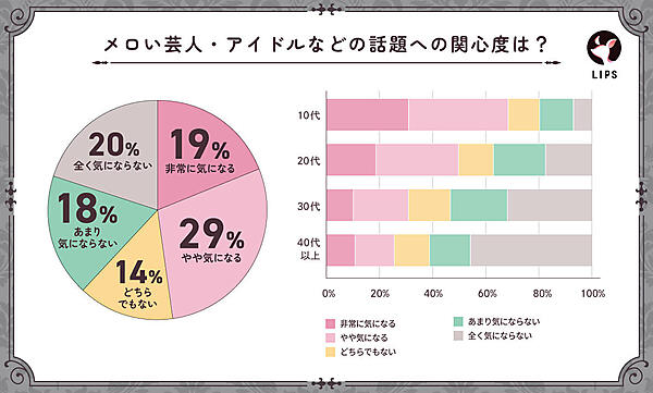 LIPSユーザーに「メロい芸人・アイドルなどの話題への関心度」を聞くと、「非常に気になる」19%、「やや気になる」29%と、半数近くが興味を示している。年代別では10代は7割近くに達している。